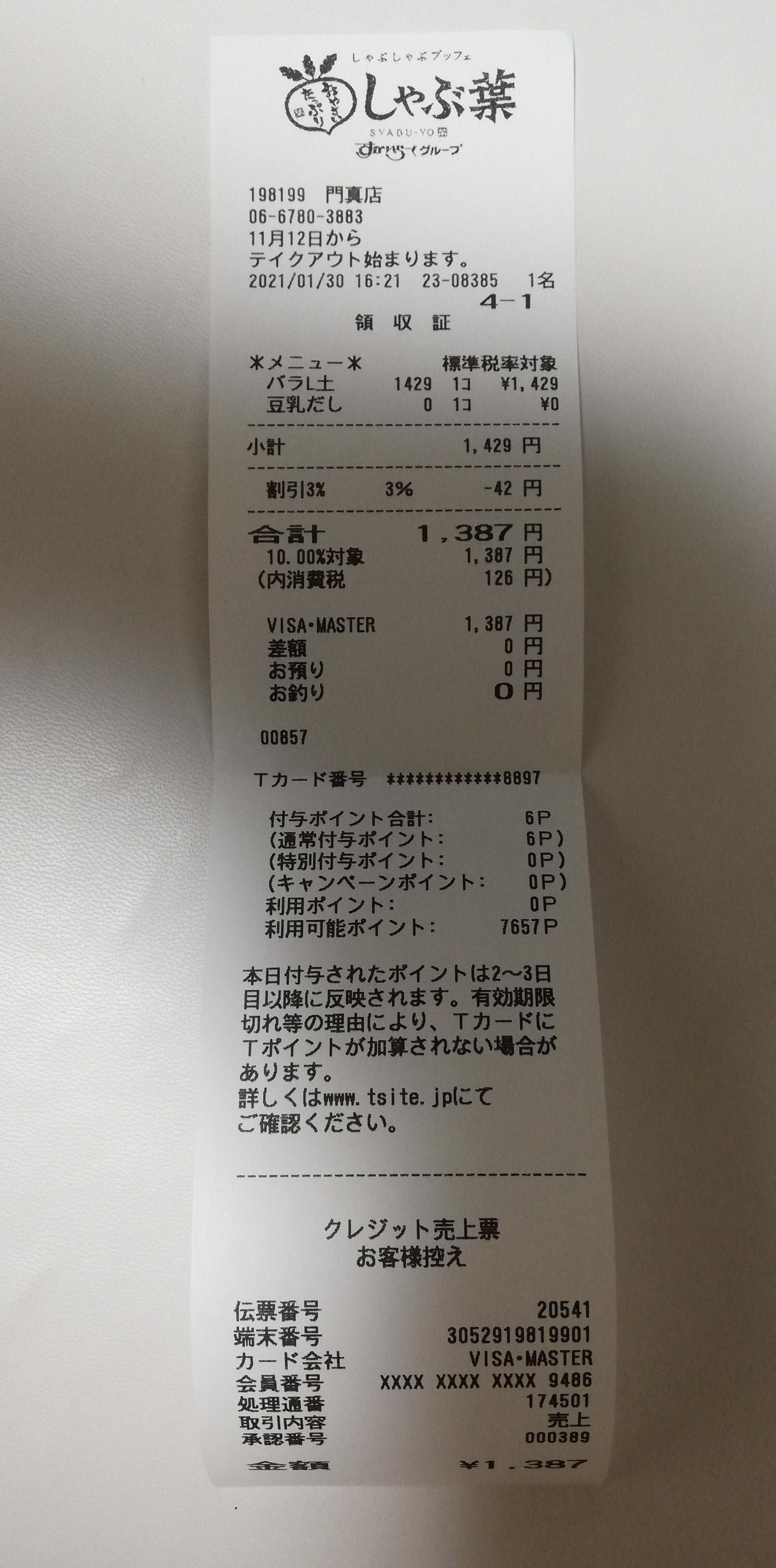 | 2021年1月30日 | pbear | しゃぶ葉 | 1,387 |